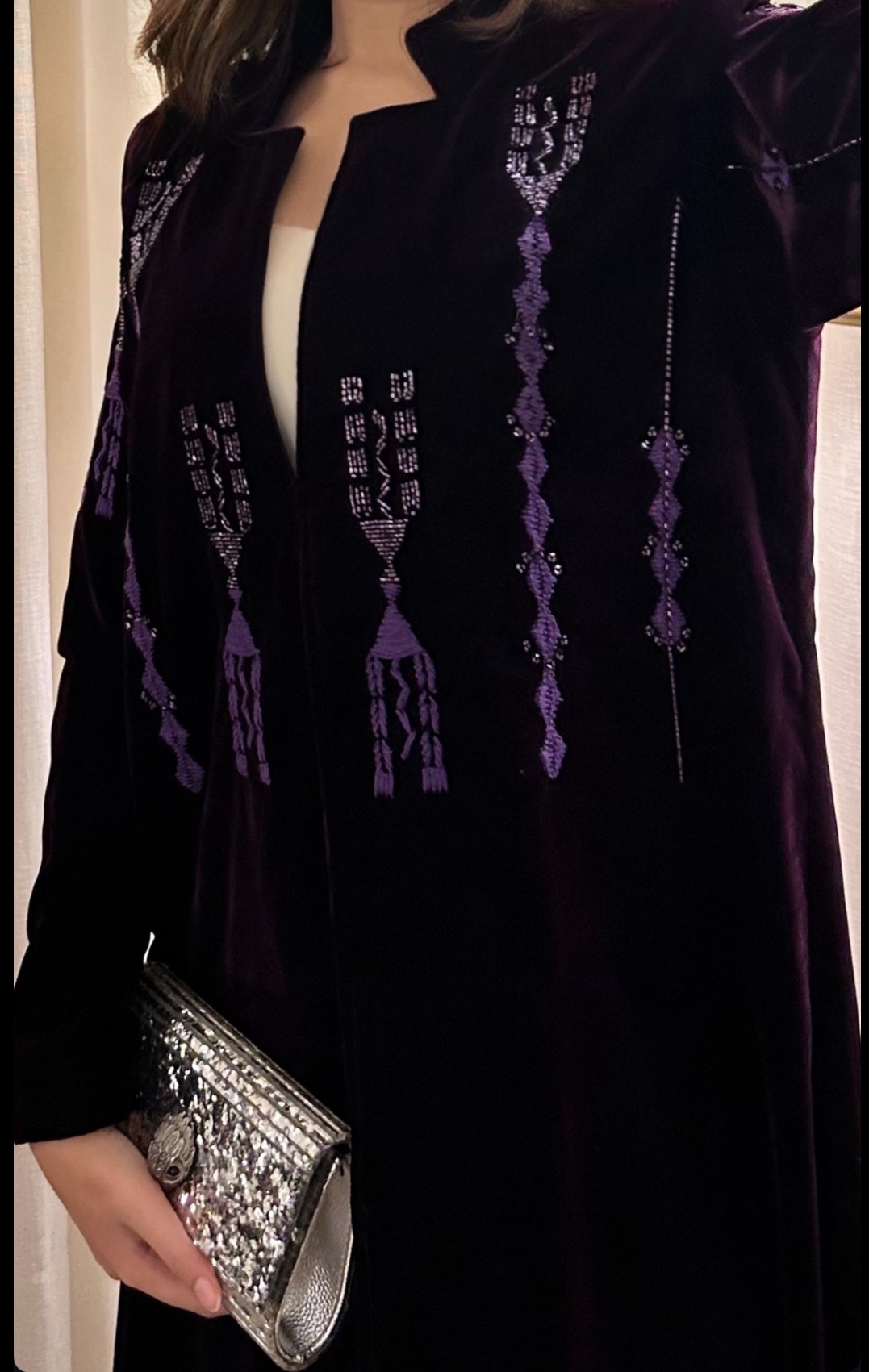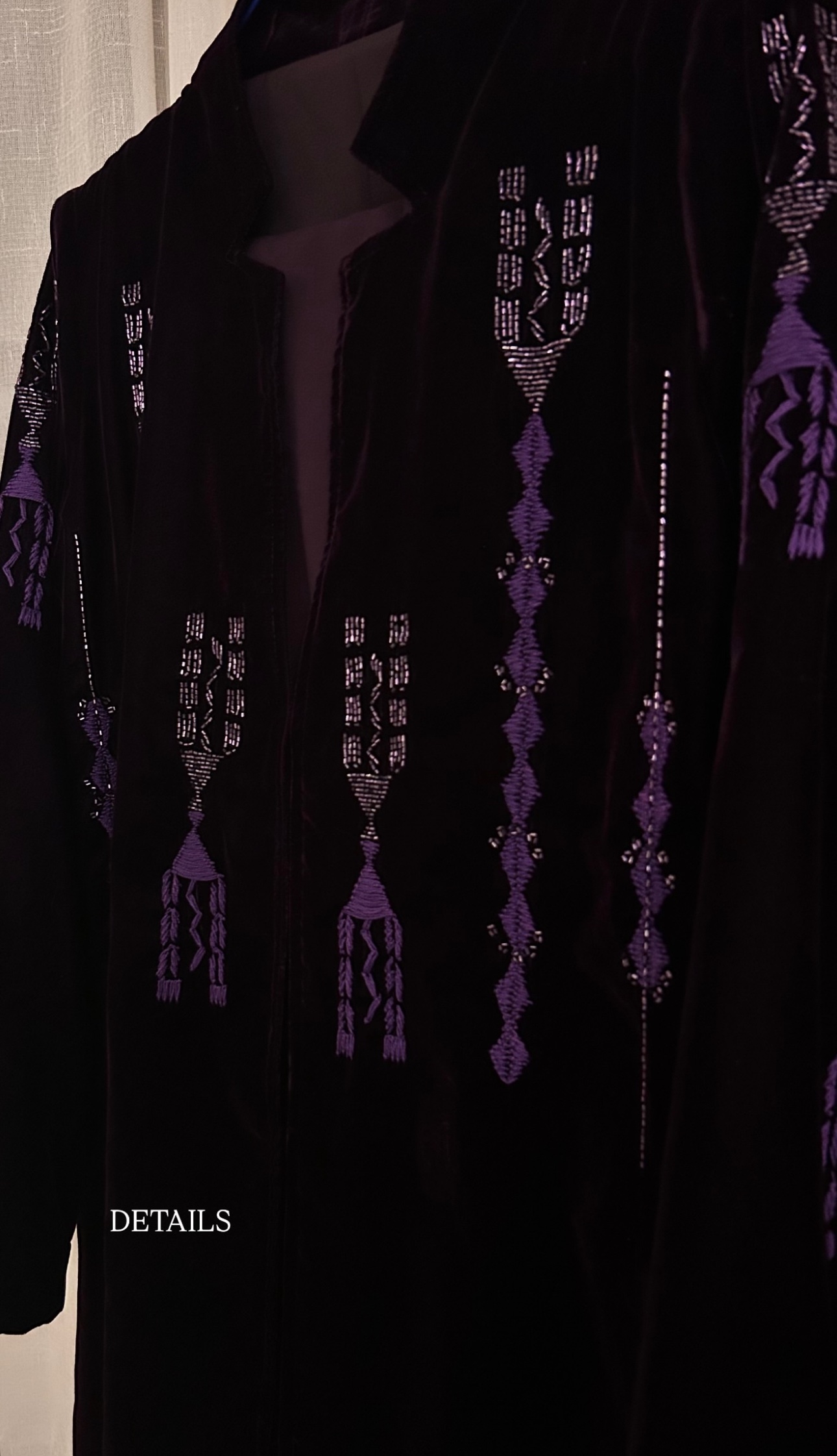 عباية مخمل فاخرة بلون بنفسجي داكن، مطرزة يدويًا بخيوط بنفسجية تضيف لمسة من الأناقة الهادئة والتفاصيل الفنية الراقية.